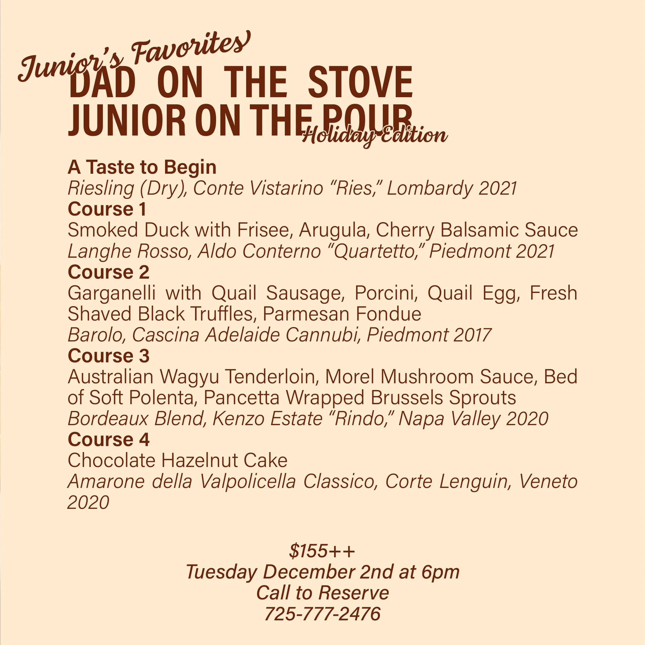 Wine Dinners TUESDAY DECEMBER 2ND AT 6PM155 PER PERSON PLUS TAX AND GRATUITYCALL THE RESTAURANT TO RESERVEView Menu on Mobile